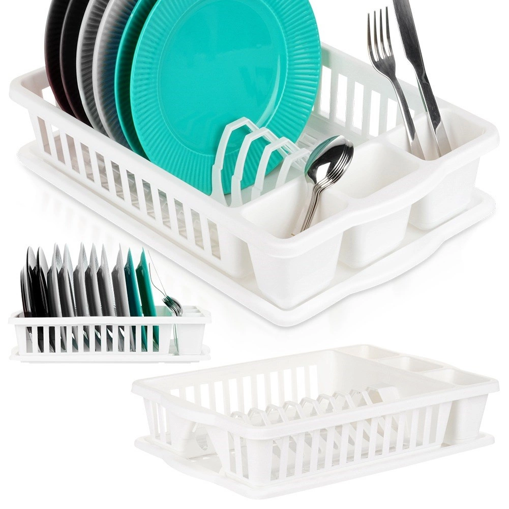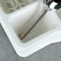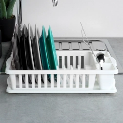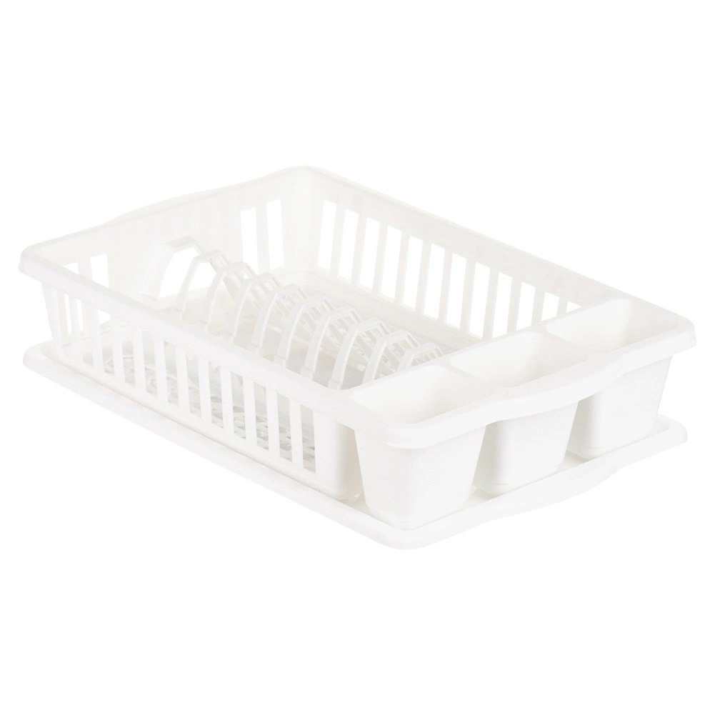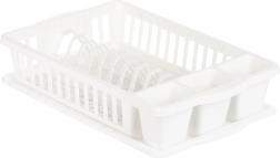 Pratique égouttoir à vaisselle blanc de 39,5 × 26 × 8,5 cm pour un séchage organisé des assiettes, verres et couverts. Il offre une grande capacité, un plateau d’égouttage amovible et une conception en plastique résistante qui protège le plan de travail de l’eau et facilite l’entretien.