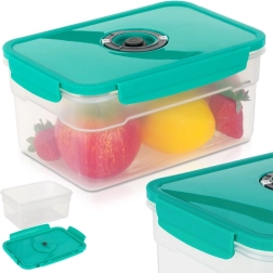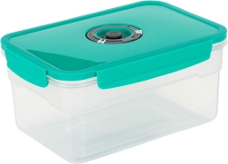Gardez vos aliments frais plus longtemps avec cette boîte sous vide de 2,3 l, dimensions 23 × 16 × 11 cm. Grâce à la valve intégrée dans le couvercle, vous évacuez facilement l’air (avec une pompe manuelle) et réduisez l’oxydation ainsi que la perte de saveur. Le corps transparent facilite le contrôle du contenu, tandis que le couvercle turquoise avec quatre clips assure une fermeture fiable et étanche.