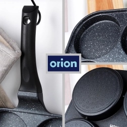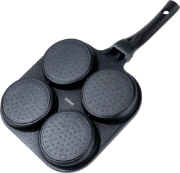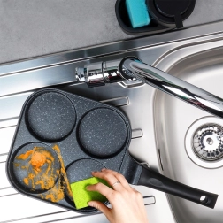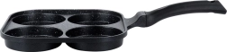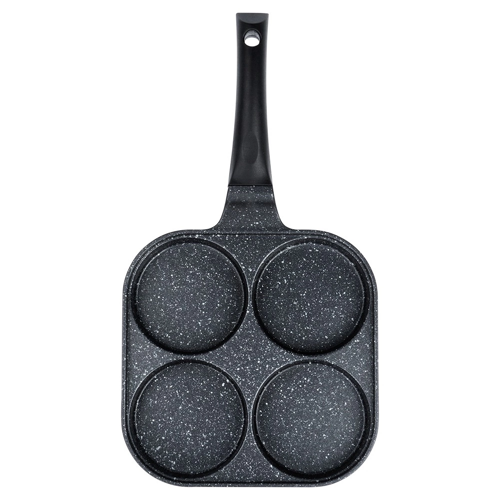Poêle carrée 22 × 22 cm avec quatre chambres séparées pour des portions uniformes et un petit-déjeuner parfaitement présenté. Le corps en aluminium avec revêtement granite antiadhésif chauffe rapidement et répartit très bien la chaleur, pour une friture rapide, économe et sans attacher. La poignée ergonomique antidérapante avec trou de suspension assure une utilisation confortable et sûre.