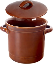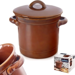 Ce récipient en céramique de qualité, émaillé brun (17 × 14 cm, hauteur 12 cm, 15 cm avec couvercle) est idéal pour la cuisine maison. Grâce à la céramique imperméable, il maintient des conditions stables pour la fermentation de légumes, la marinade de fromages ou de saucisses, ainsi que pour le stockage du saindoux, des pâtés ou des tartinades.