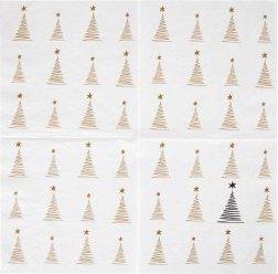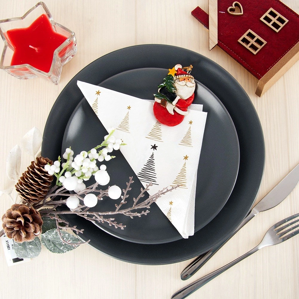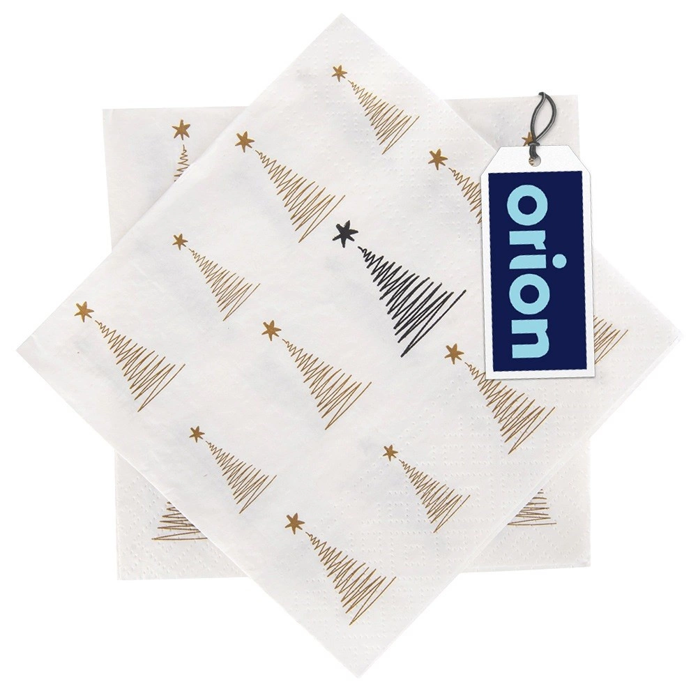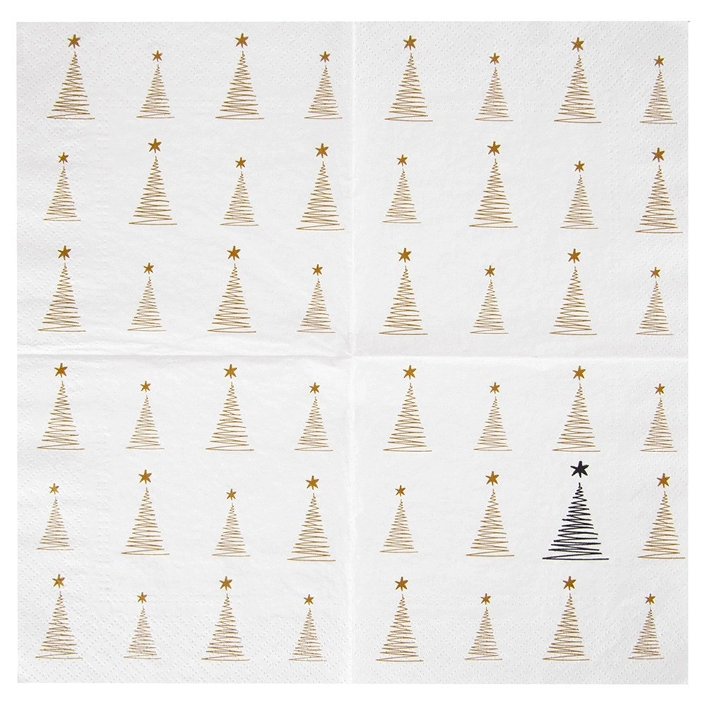 Apportez une atmosphère festive à votre table avec ces serviettes en papier blanches au motif de sapins dorés. Grâce à leur structure 3 plis, elles sont agréables au toucher, résistantes et absorbent efficacement les liquides. Une fois dépliées, elles mesurent 33 × 33 cm (pliées 16,5 × 16,5 cm), parfaites pour le plat principal comme pour le dessert.