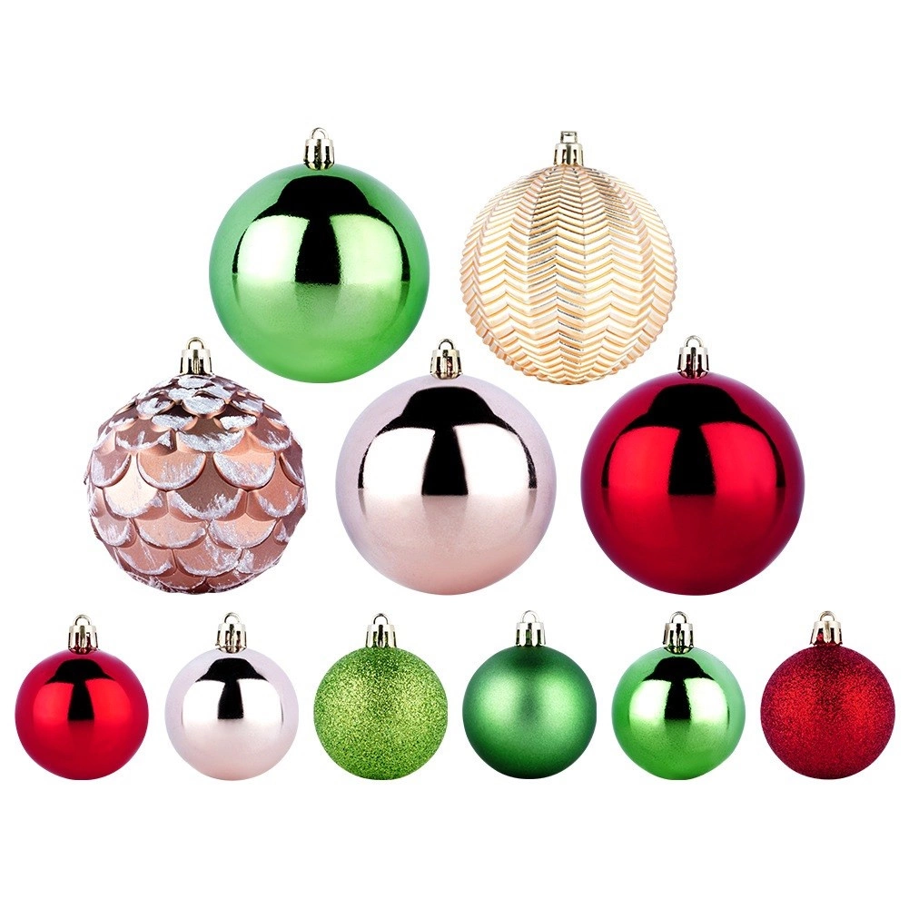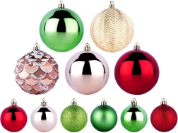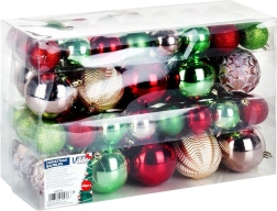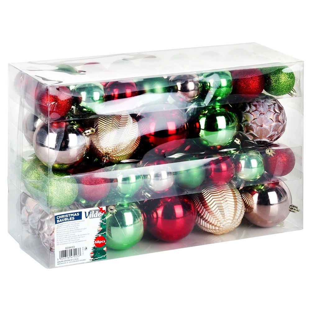 Le coffret comprend 20 boules de 8 cm de diamètre (rouges brillantes, dorées texturées, roses claires brillantes et texturées, vertes brillantes) et 48 boules de 5 cm (rouges brillantes 6×, vertes pailletées 6×, roses claires brillantes 6×, rouges pailletées 12×, vertes brillantes 12×, vertes mates 6×). Chaque décoration est dotée d’un œillet métallique et des ficelles sont incluses pour une mise en place immédiate.