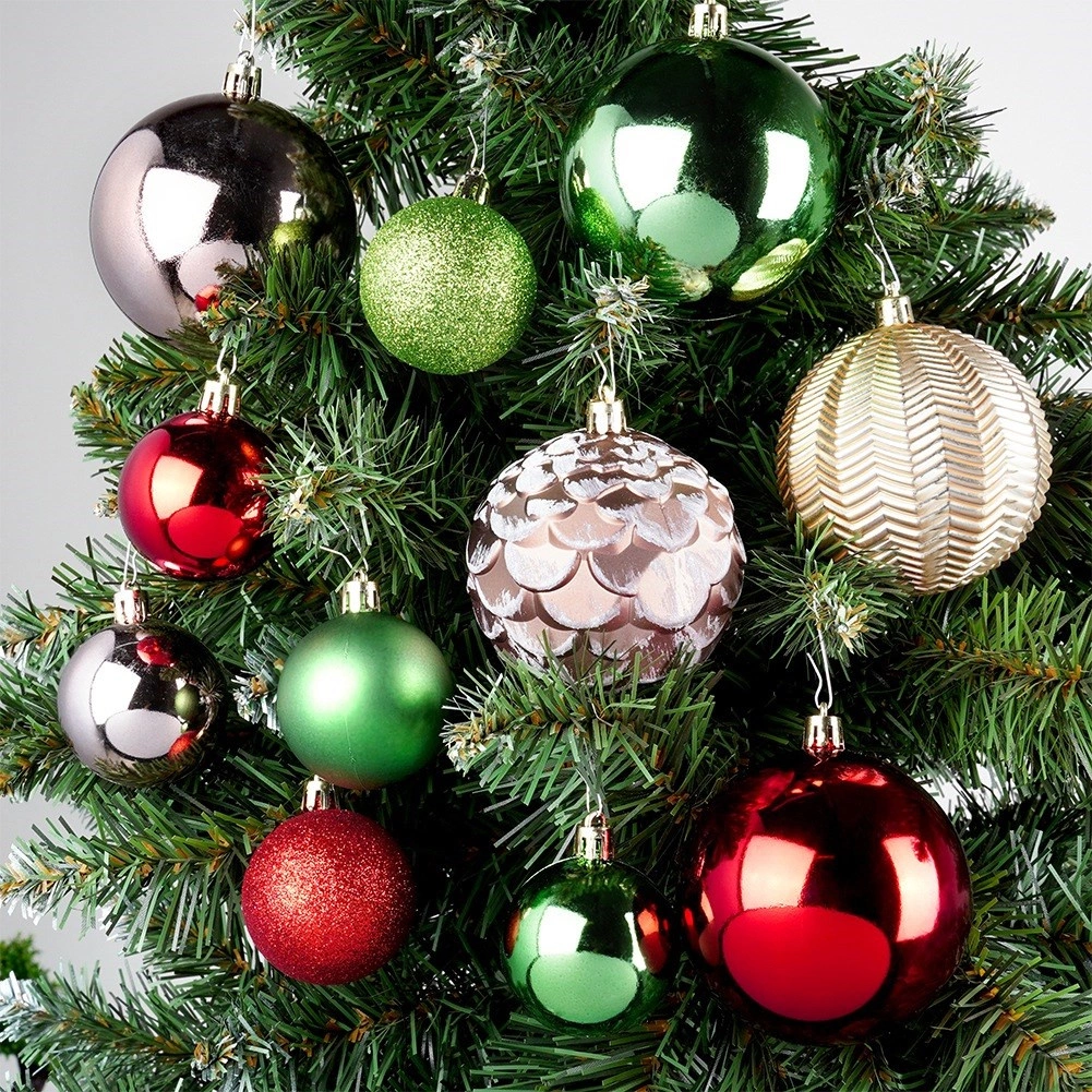La combinaison de boules de 8 cm et 5 cm, aux finitions brillantes, mates, pailletées et texturées, crée une décoration de Noël dynamique et élégante.