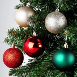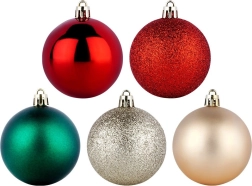 La boîte contient des combinaisons soigneusement assorties pour une décoration facile : boules rouges mates et brillantes, champagne mates et pailletées, et boules vertes mates. Grâce au diamètre uniforme de 6 cm, elles se combinent à merveille et garnissent le sapin de la cime aux branches inférieures.
