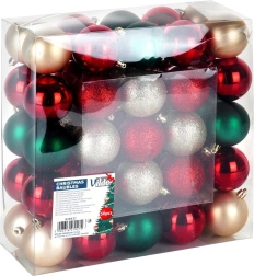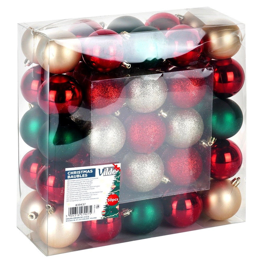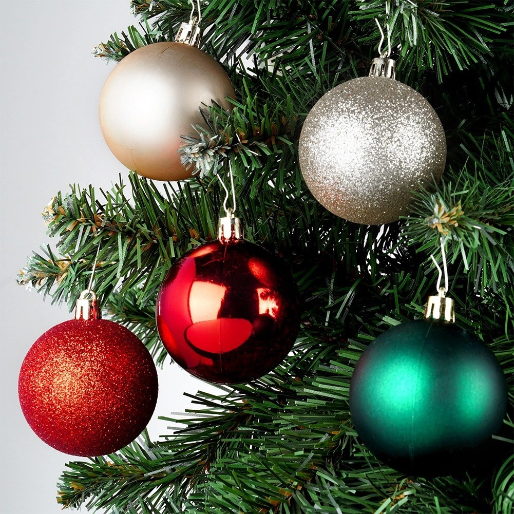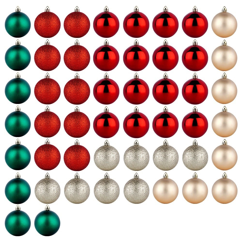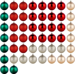 Set stylé de 50 boules de Noël incassables de 6 cm de diamètre, en couleurs rouge, vert et champagne, avec finitions brillante, mate et pailletée. Décorations en plastique résistant avec capuchons métalliques et ficelles pour suspendre, apportant un éclat classique au sapin et créant une ambiance festive magique – un choix sûr pour les foyers avec enfants et animaux de compagnie.