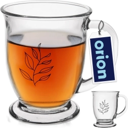 Grande tasse en verre de 450 ml, idéale pour vos boissons chaudes préférées. Grâce au verre transparent et épais, vous profitez de la couleur du thé ou du café, tandis que l’anse ergonomique assure une prise en main confortable. Le design classique avec motif de feuille s’accorde à tout art de la table.