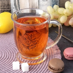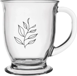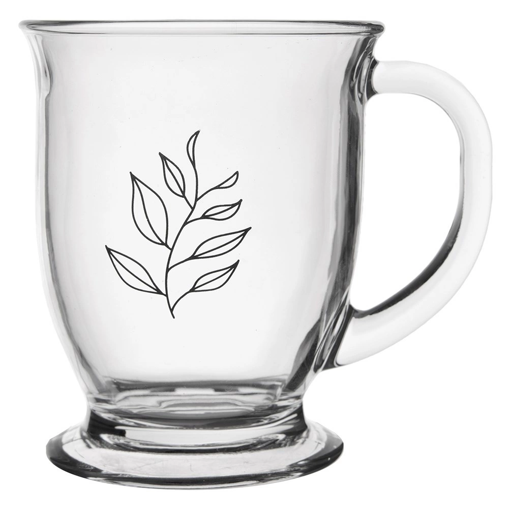 Tasse en verre pratique de 450 ml pour boire quotidiennement du thé, du café ou du cacao. Fabriquée en verre épais de haute qualité avec une anse robuste, dotée d’une base stable et d’un motif de feuille qui apporte une touche d’élégance à toute table. Compatible lave-vaisselle et micro-ondes.