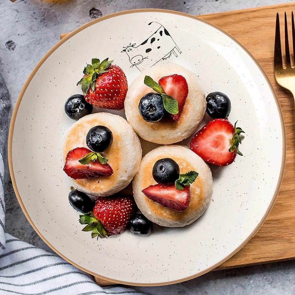 Faites de chaque service une petite fête. L’assiette à dessert de 20 cm de diamètre, en céramique de qualité dans un beige tendance avec un effet moucheté et un liseré en grès naturel, allie élégance et convivialité. Le motif en relief de petite vache apporte une touche d’originalité et attire le regard au premier coup d’œil.