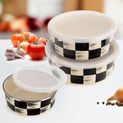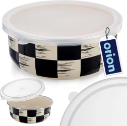 Pratique bol émaillé avec couvercle d’une capacité de 800 ml au style rétro, idéal pour conserver, servir et transporter des aliments, ainsi que pour réchauffer sur la plaque. Il mesure 15,5 × 6 cm, arbore un élégant motif échiquier noir‑beige et un émaillage sûr adapté aussi aux personnes allergiques. Compatible lave‑vaisselle et pour tous types de cuisinières, y compris induction.
