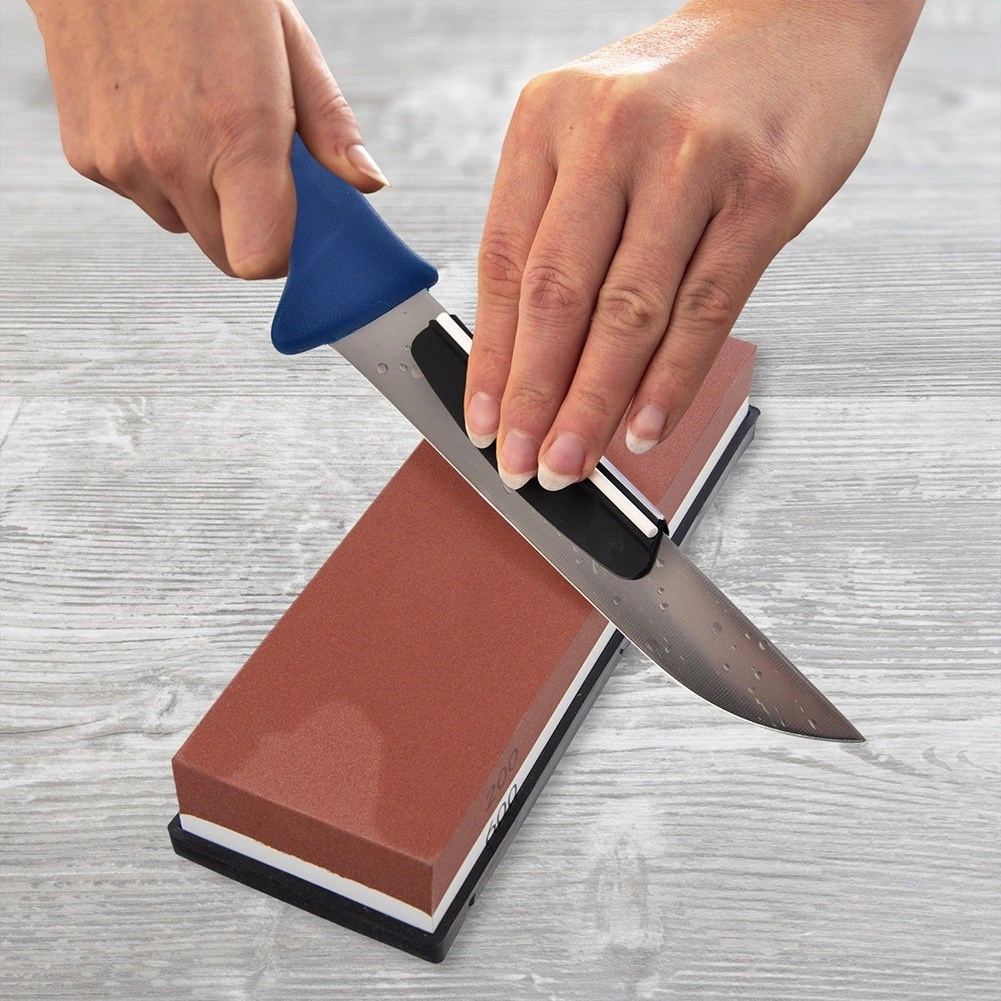 Pierre à aiguiser universelle à deux couches en corindon durable, idéale pour affûter couteaux de cuisine, ciseaux, ciseaux à bois et outils de jardin. Le grain 200 restaure rapidement le tranchant, le grain 600 l’affine et le polit. Inclut un guide d’angle (15–20°) pour un angle constant et une conduite de lame sûre.