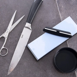 Restaurez le tranchant de vos couteaux de cuisine facilement et en toute sécurité. La pierre à eau double face en corindon résistant combine une face #240 pour le redressage rapide du fil et une face #1200 pour la finition et le polissage. Le socle en silicone antidérapant maintient la pierre stable, tandis que le guide d’angle fourni assure un angle constant et un résultat professionnel.