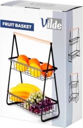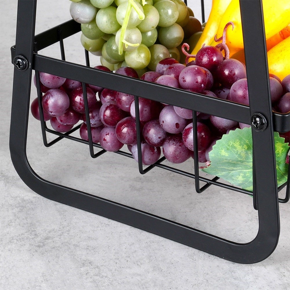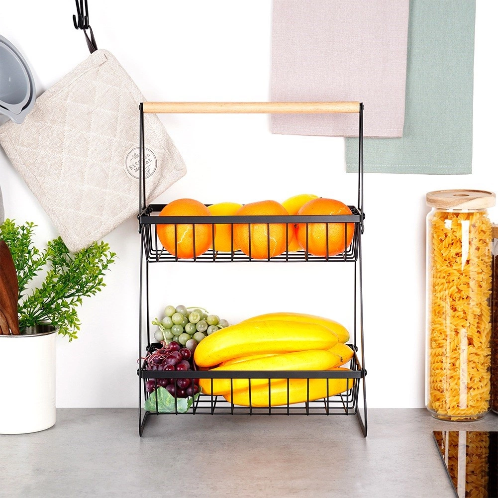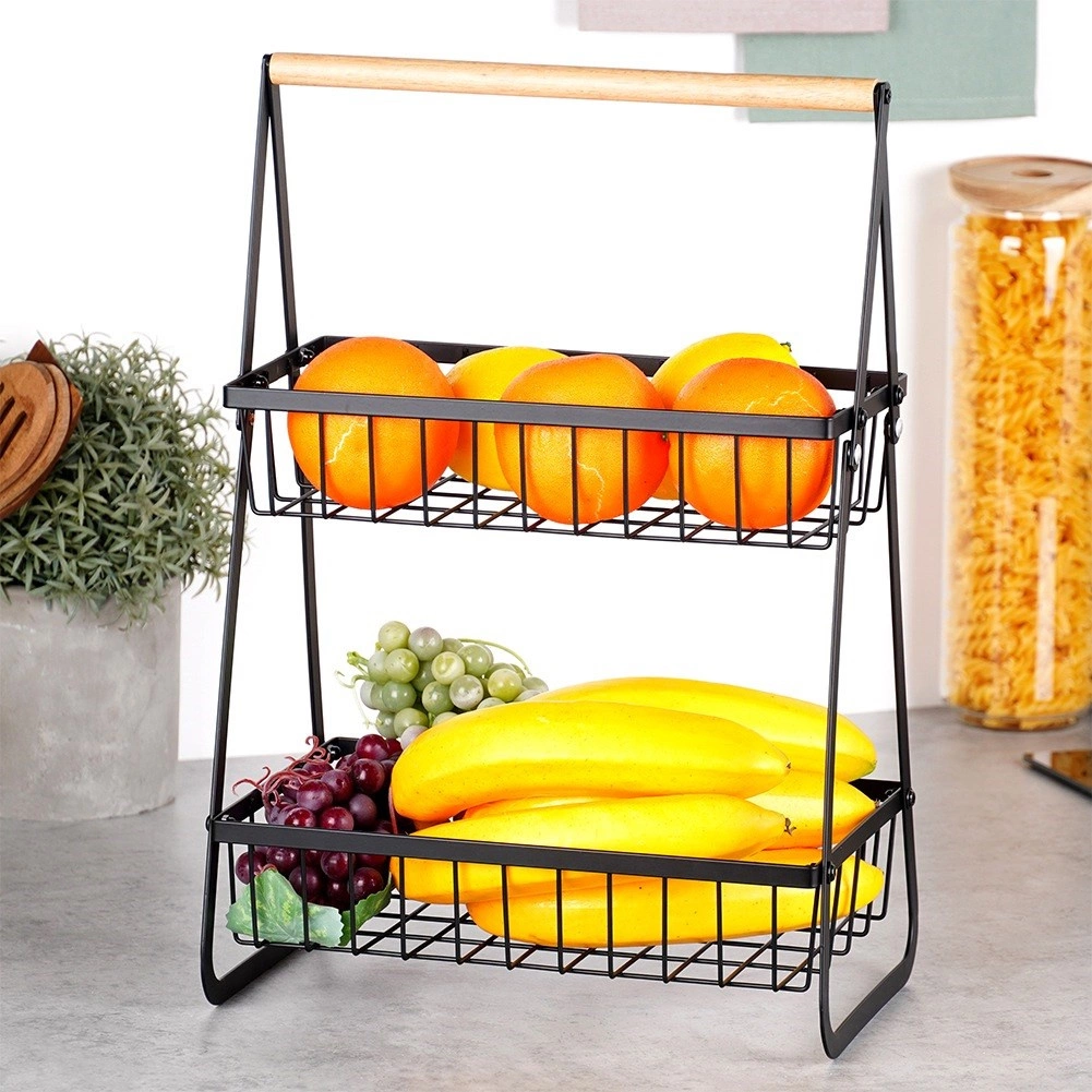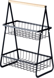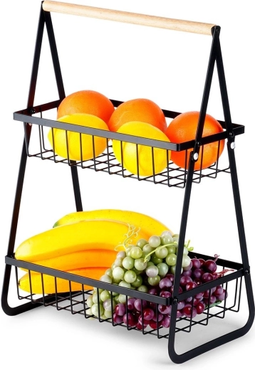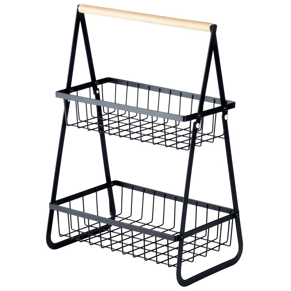 Élégant panier à fruits et légumes à deux niveaux en noir, alliant gain de place, structure métallique robuste et poignée en bois pratique pour un transport facile. Les paniers en fil ouvert assurent une excellente circulation de l’air et une bonne visibilité du contenu, pour des fruits plus frais plus longtemps et une belle présentation sur le plan de travail ou l’étagère.