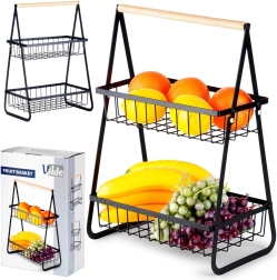 Panier métallique à fruits à deux niveaux, noir avec poignée en bois