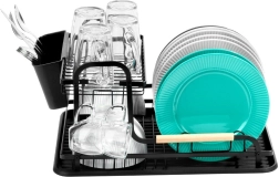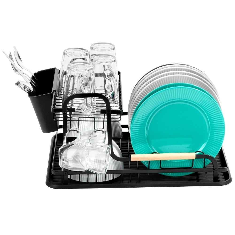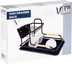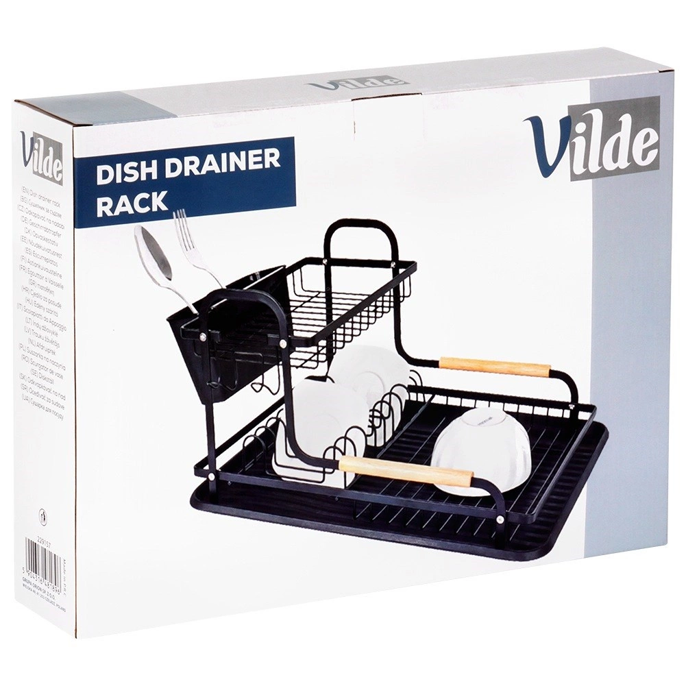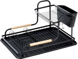 Le cadre robuste en métal résistant avec finition noire mate est complété par de élégantes poignées en bois pour un transport facile. Le panier à couverts amovible à deux compartiments aide à garder l’ordre et accélère le séchage. L’égouttoir se nettoie aisément et est conçu pour un confort au quotidien.