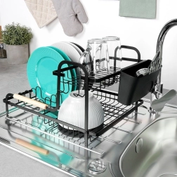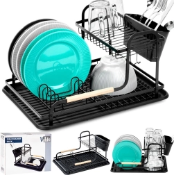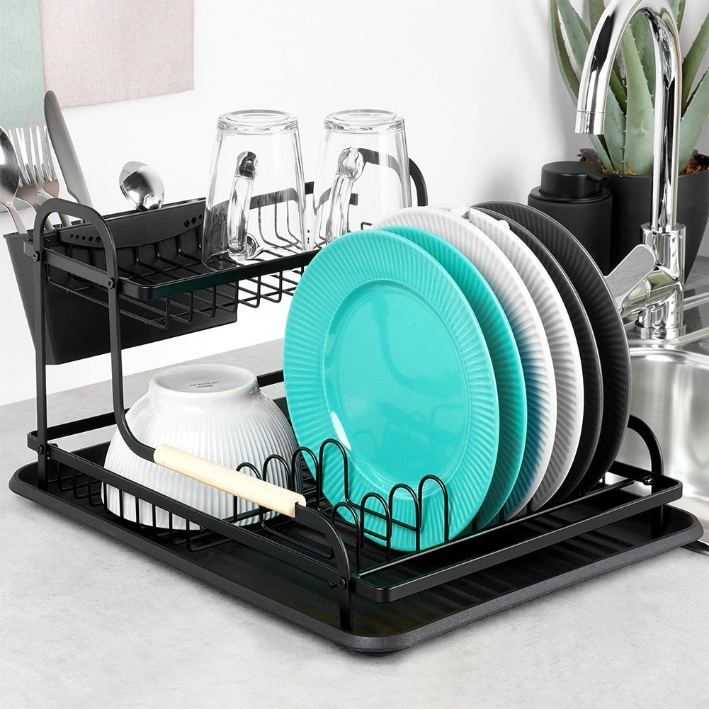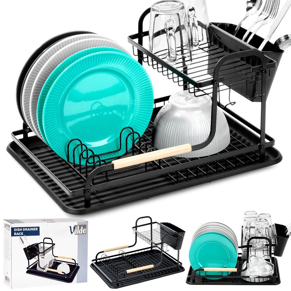 Égouttoir à vaisselle élégant à deux niveaux, dimensions 48,5 × 32 × 23,5 cm, qui organise efficacement assiettes, verres et couverts tout en protégeant le plan de travail de l’eau. Il combine une structure métallique robuste en noir mat avec des accents en bois, dispose d’un plateau d’égouttage pratique et d’un panier à couverts amovible à deux compartiments. Grâce à ses deux niveaux, il offre une grande capacité et un séchage plus rapide dans toutes les cuisines, modernes comme classiques.