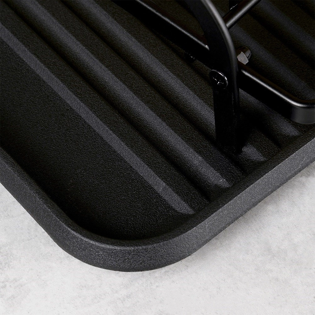 Métal robuste en noir mat, poignées en bois pour un transport aisé et plateau d’égouttage qui protège la surface de travail.