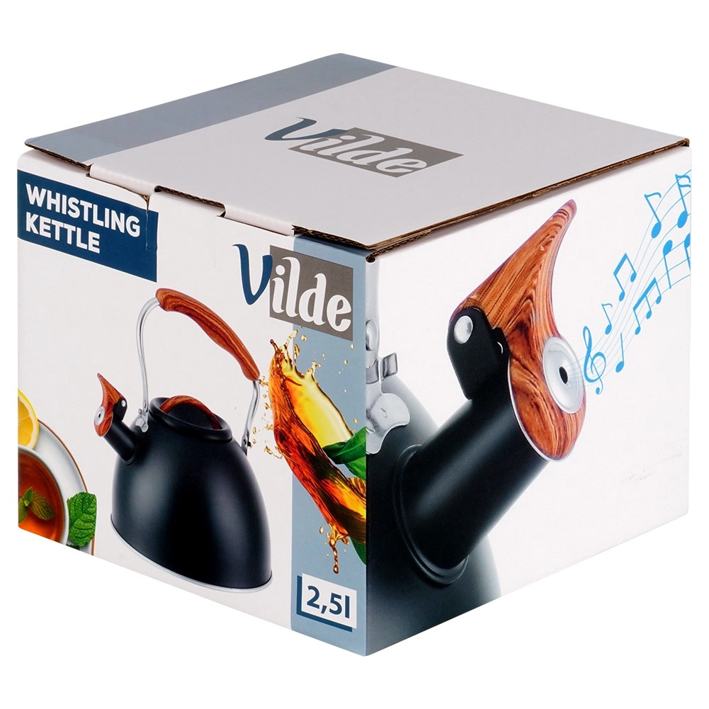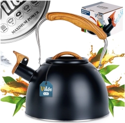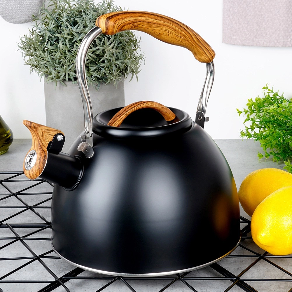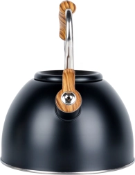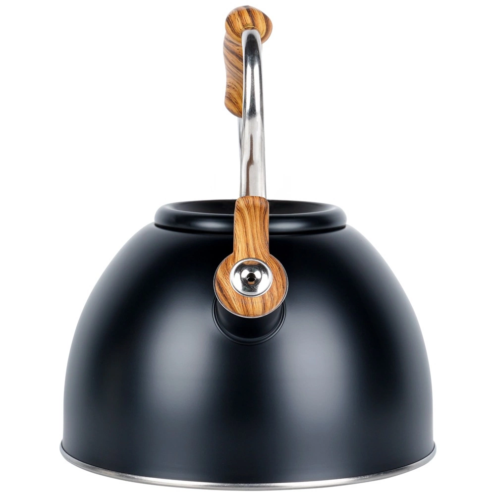 Bouilloire noire avec sifflet en acier inoxydable de haute qualité, capacité 2,5 l, offrant un chauffage rapide, une poignée ergonomique Soft Touch et un fond acuthermique pour une cuisson économe en énergie sur tous les types de plaques, y compris à induction.