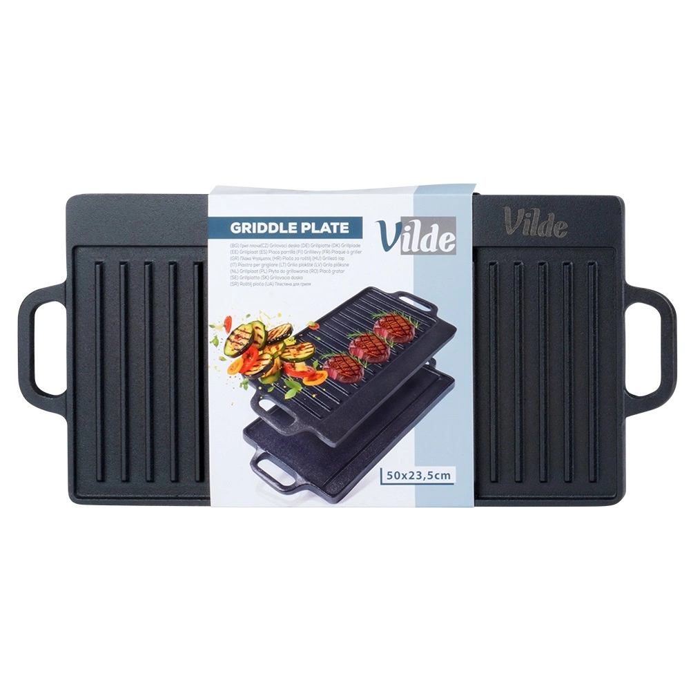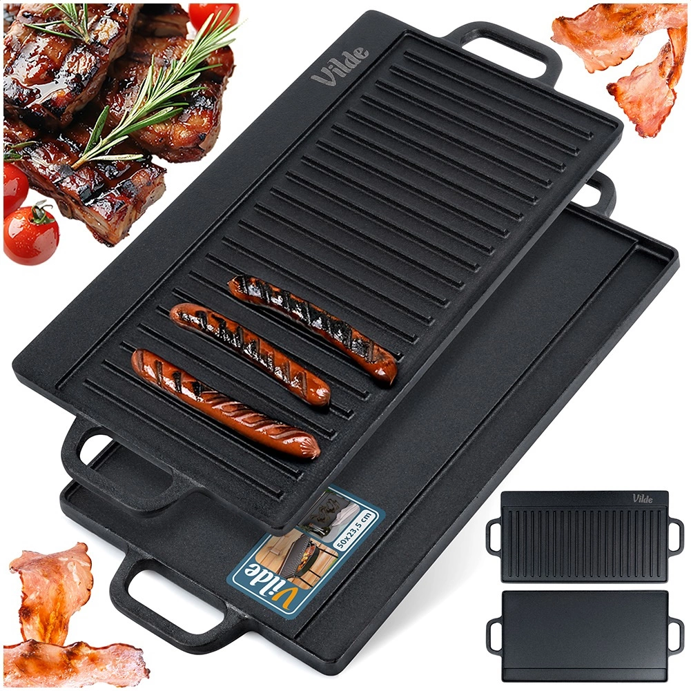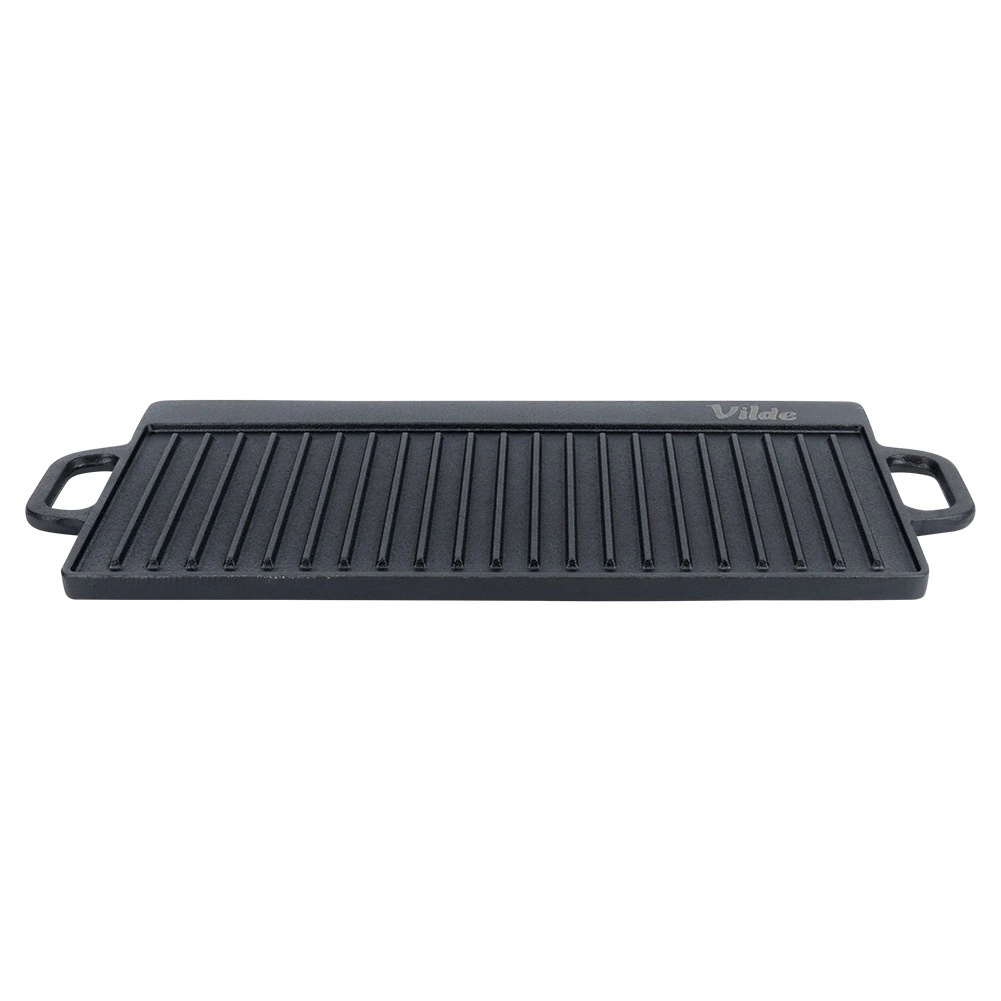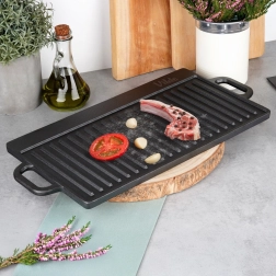 Découvrez la polyvalence de la plaque en fonte CAST LINE : une face lisse pour crêpes, œufs ou fruits de mer, l’autre striée pour des marques de grill prononcées sur steaks, légumes et saucisses. La fonte massive assure une excellente accumulation de chaleur et un chauffage uniforme de toute la surface, offrant des résultats juteux avec un minimum d’adhérence.