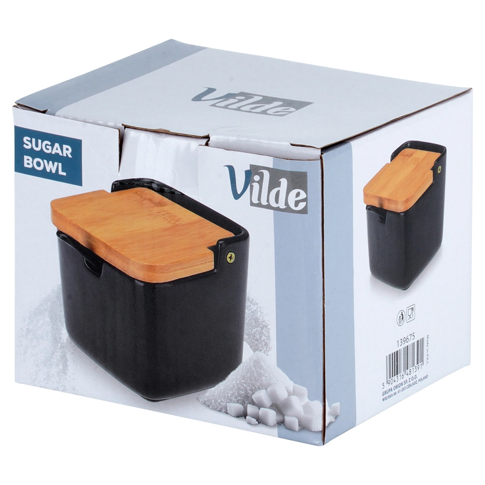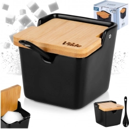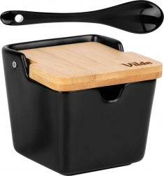 Ce sucrier au design minimaliste complétera parfaitement toute cuisine ou salle à manger. La céramique noire mate combinée au bambou naturel offre une allure élégante tout en étant très pratique au quotidien. Grâce au couvercle basculant et à l’encoche pour la cuillère, le sucre ou le sel restent toujours à portée de main et protégés.