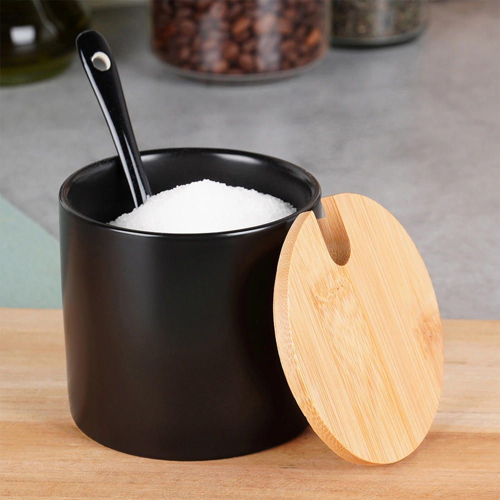 Élégant sucrier noir avec couvercle en bambou et encoche intégrée pour la cuillère, pour un dosage facile. Idéal pour le sucre, le sel et les épices, avec une capacité de 250 ml et des dimensions de 8,5 × 8 cm. Cuillère en céramique de 13 cm incluse. Céramique durable, rangement pratique et design moderne qui complètent à merveille toute cuisine ou café.