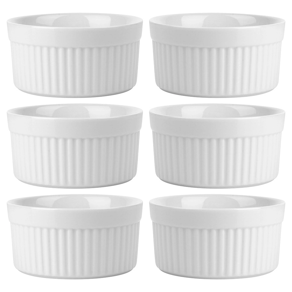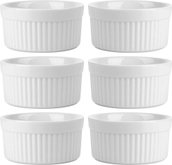 Pratique set de six ramequins blancs de 260 ml offrant une solution élégante pour la cuisson et le service. Les bols en céramique de qualité sont résistants à la chaleur jusqu’à 350 °C, compatibles avec le four, le micro-ondes et le lave-vaisselle. Grâce à leur design classique à cannelures et à l’émail lisse, ils sont parfaits pour la crème brûlée, les soufflés, les petites portions gratinées, les sauces ou les snacks.