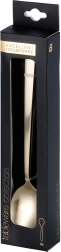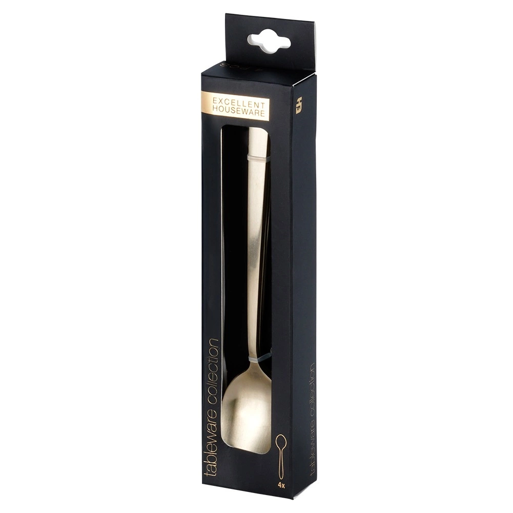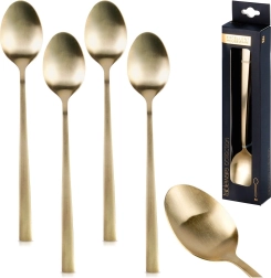 Set élégant de quatre longues cuillères à cocktail en acier inoxydable avec fini doré satiné. Idéales pour le latte, les cocktails, les desserts et les boissons dans des verres hauts. Les cuillères mesurent 3 × 18 cm, sont sans danger pour le contact alimentaire et compatibles lave-vaisselle.