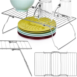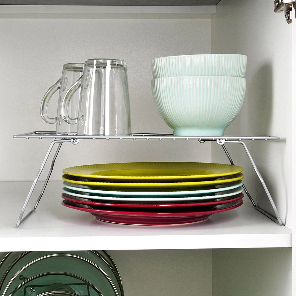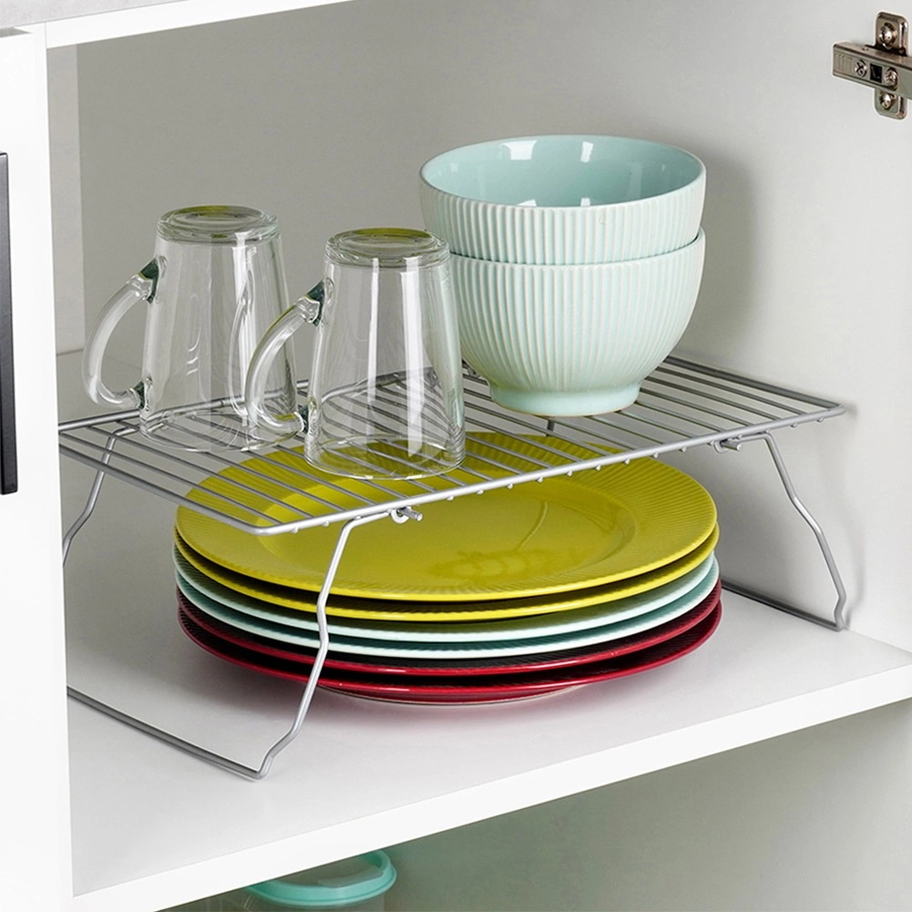 Cette étagère métallique pour placard de cuisine crée deux niveaux à l’intérieur, ce qui permet de ranger facilement assiettes, bols et tasses, tout en exploitant au maximum la hauteur du meuble. Les pieds pliants permettent un réglage en un clin d’œil et un rangement compact lorsque vous n’en avez pas besoin.