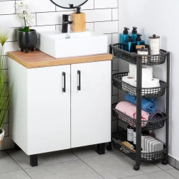 La structure en plastique résistant de couleur noire allie légèreté et robustesse. L’étagère se monte facilement et peut, si nécessaire, être démontée pour un encombrement réduit. Utilisation en cuisine pour bocaux, condiments et provisions, dans la salle de bain pour serviettes et cosmétiques, au bureau pour accessoires, et au garage pour les outils.