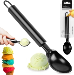 Cuillère à glace pratique en acier inoxydable résistant avec une élégante finition noire mate, longueur 19 cm. Grâce à la cuvette profonde, vous formez facilement des boules régulières, tandis que la construction robuste assure un prélèvement aisé même dans les glaces dures. La poignée ergonomique avec œillet de suspension et la possibilité de lavage au lave-vaisselle en font un accessoire idéal pour toute cuisine.