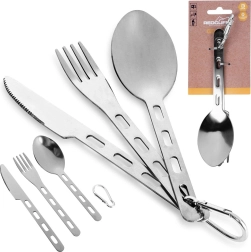 Les couverts sont fabriqués en acier inoxydable de qualité, résistant à la corrosion, capable de supporter les conditions exigeantes du camping et une utilisation prolongée.