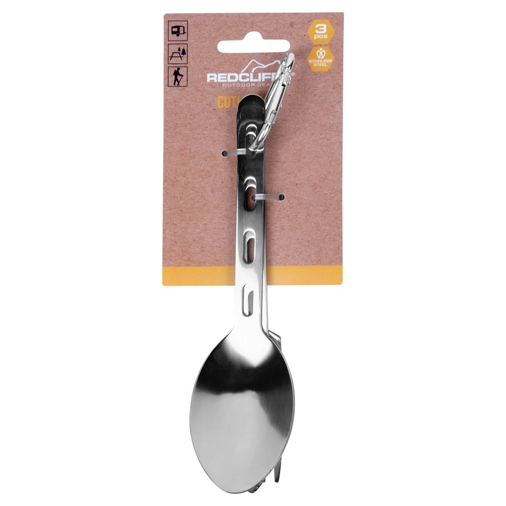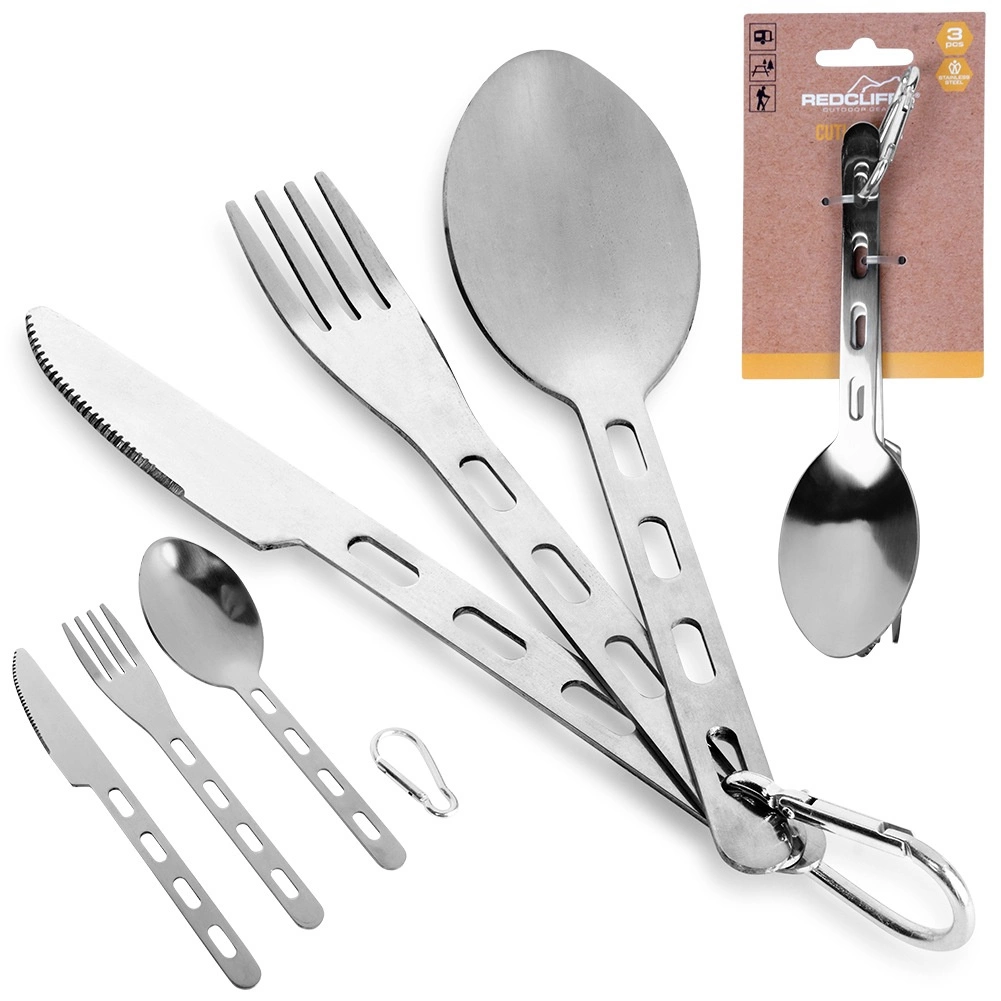Ensemble pratique de couverts de camping en acier inoxydable avec mousqueton pour un accrochage et un transport faciles. Comprend une cuillère, une fourchette et un couteau au design léger et compact, idéal pour le camping, les excursions et les voyages. L’acier inoxydable résistant garantit une longue durée de vie, un entretien facile et le lavage au lave-vaisselle. Qualité éprouvée REDCLIFFS.