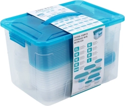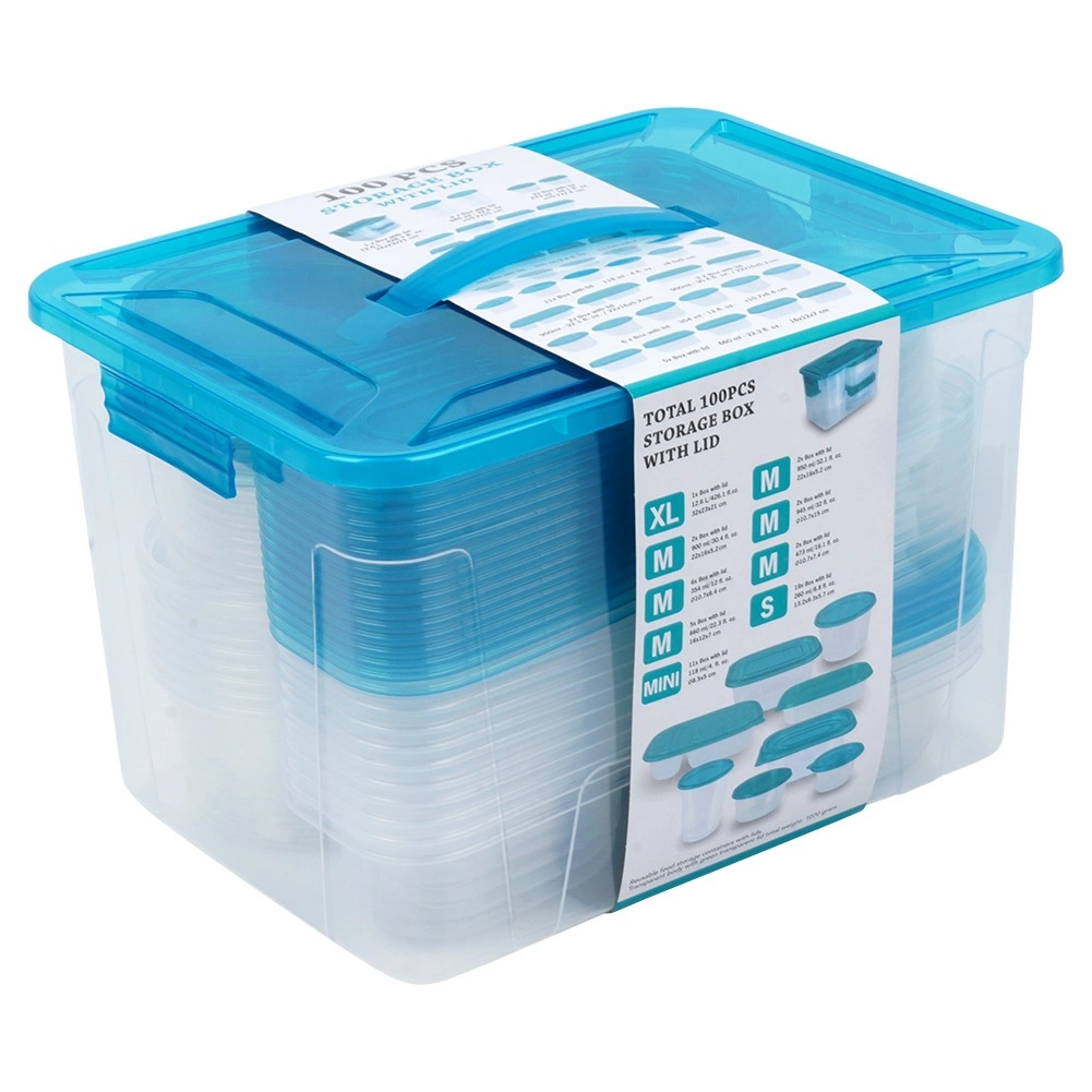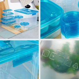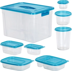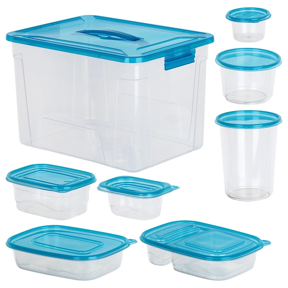 Ensemble pratique de boîtes alimentaires transparentes avec couvercles bleus en neuf tailles pour un usage quotidien. Fermeture hermétique pour garder les aliments frais plus longtemps, design empilable et encastrable pour gagner de la place, et grand coffret avec poignée pour ranger facilement tout le set. Les boîtes sont sûres pour les aliments, adaptées au réfrigérateur, congélateur, lave-vaisselle et micro-ondes (chauffage sans couvercle).