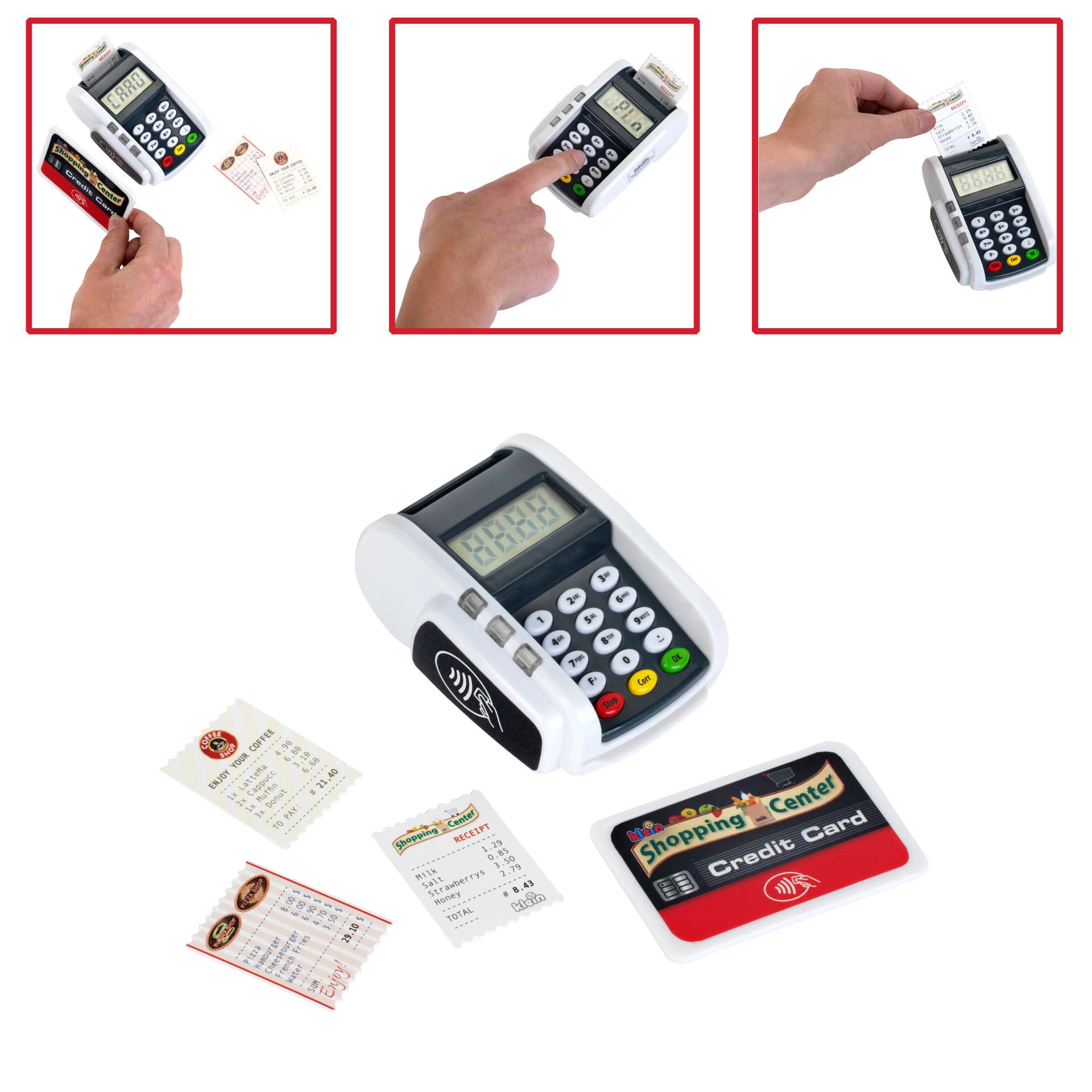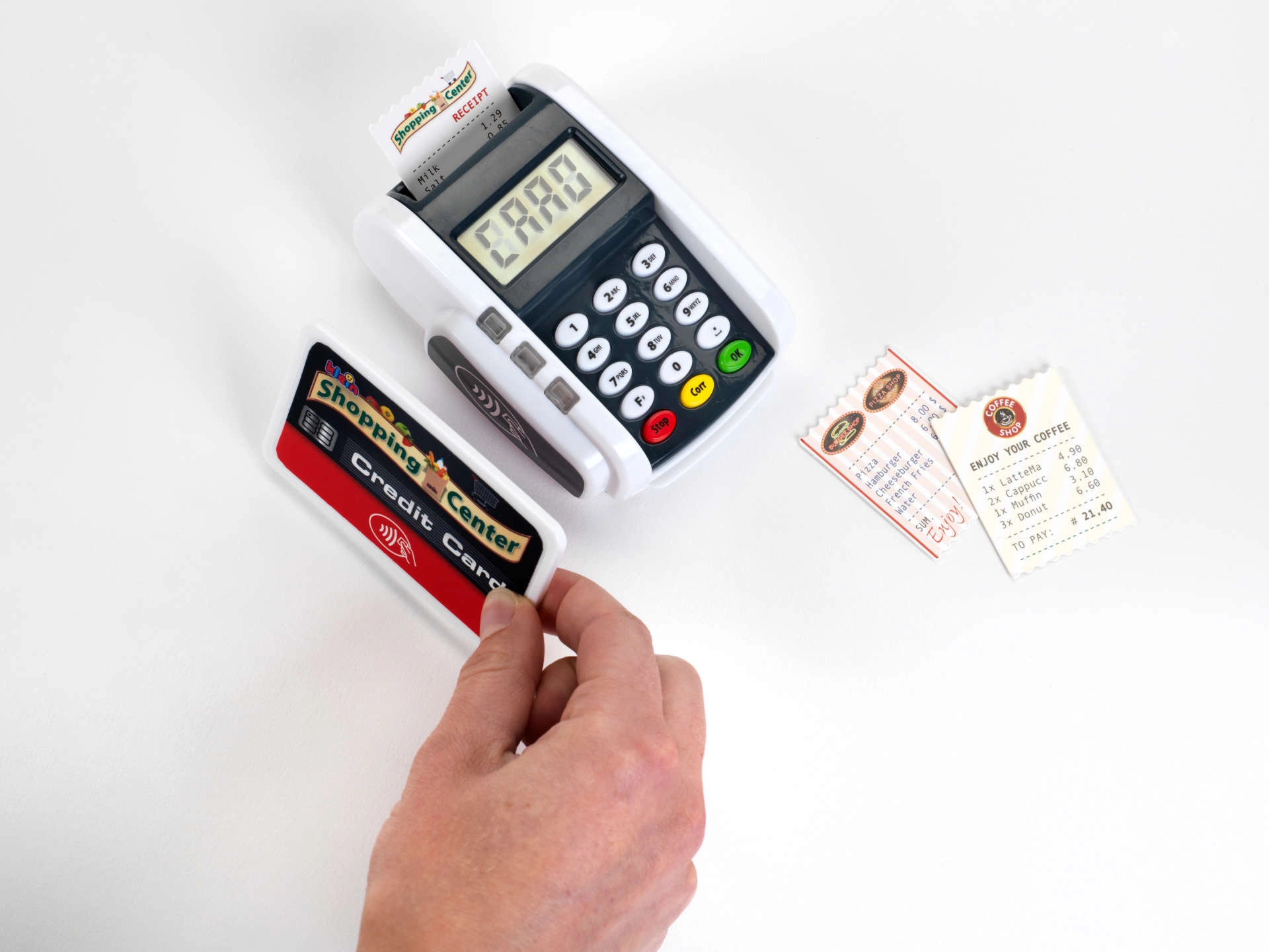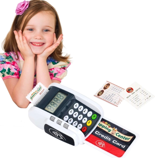 Ce terminal compact imite fidèlement un véritable appareil : les enfants peuvent appuyer sur le clavier numérique, présenter une carte de paiement et imprimer des « reçus » pour un jeu de caisse réaliste. Les effets lumineux et sonores donnent à chaque transaction une touche de réalité et favorisent le développement des compétences sociales.