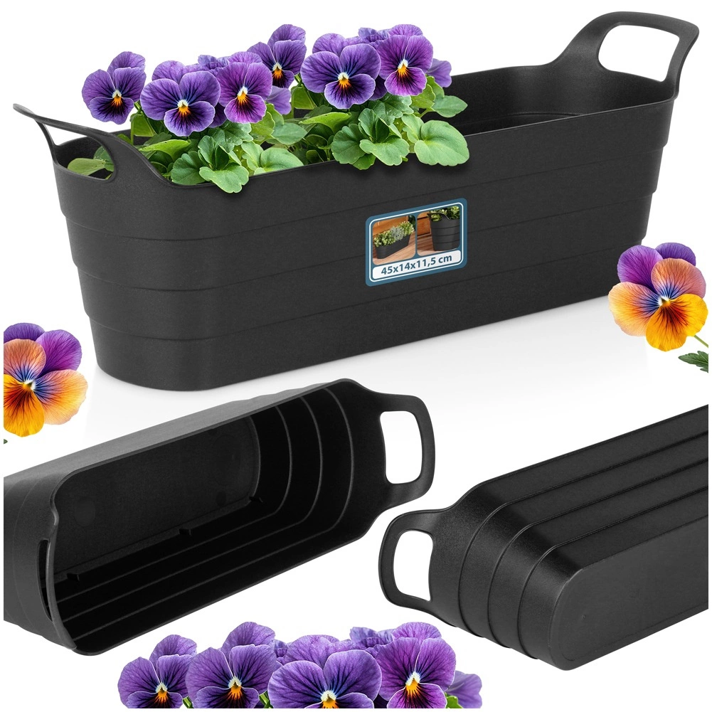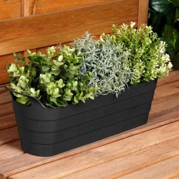 La jardinière allongée 44,5 × 13,5 × 14,5 cm (hauteur sans poignées 11,5 cm) met en valeur vos plantes, fleurs et herbes favorites. Grâce au plastique recyclé de qualité, elle est légère, robuste et facile à nettoyer, parfaite pour un usage quotidien en intérieur comme en extérieur.