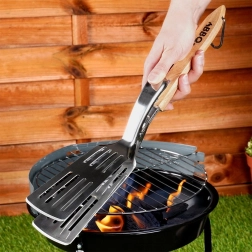 Grâce au mécanisme à déclic (de serrage), l’outil saisit et maintient facilement les aliments sans glisser – idéal pour retourner steaks, filets et légumes. Sa conception simple permet un nettoyage rapide et un usage polyvalent non seulement au barbecue, mais aussi en cuisine pour la friture.
