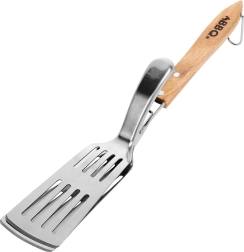 Spatule et pince de grillade 2‑en‑1 en acier inoxydable avec manche en bois et tête perforée pour un retournement facile, le service et l’évacuation de l’excès de graisse. Grâce au mécanisme de serrage, tout se fait confortablement d’une seule main – idéal pour la viande, les légumes, les burgers et le poisson.