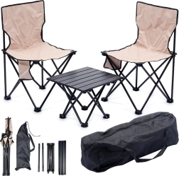 Ensemble de camping compact avec deux chaises pliantes et une table pratique, le tout dans un sac de transport. Idéal pour le camping, la plage, la pêche et le jardin. Offre une structure métallique stable, un tissu polyester résistant de couleur beige et un pliage/dépliage rapide sans outils.