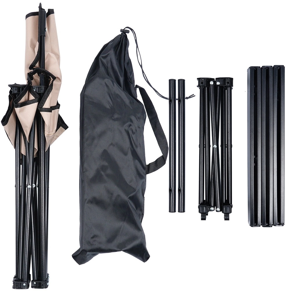 L’accent sur la stabilité et la durabilité est assuré par un cadre en acier noir et un tissu polyester robuste dans une élégante teinte beige. Grâce à ses dimensions compactes, le set est parfait pour le camping, les pique-niques, les sorties de pêche et la détente au jardin.