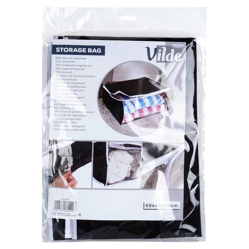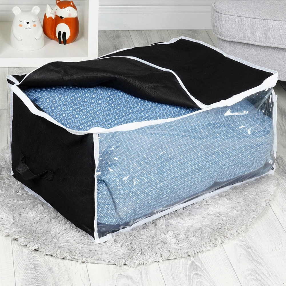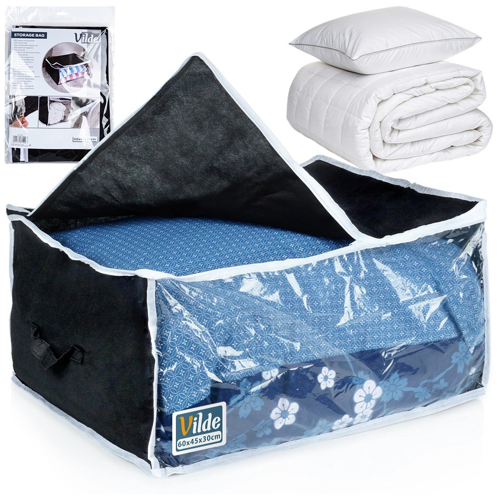 Pratique sac de rangement pour linge de lit, couvertures, oreillers et vêtements, protégeant les affaires de l’humidité, de la poussière et des mites. Grâce à ses dimensions 65 × 45 × 30 cm et à son volume de 87 l, il offre un grand espace de rangement, un stockage facile dans l’armoire comme sous le lit et une vue d’ensemble rapide grâce à la fenêtre transparente.