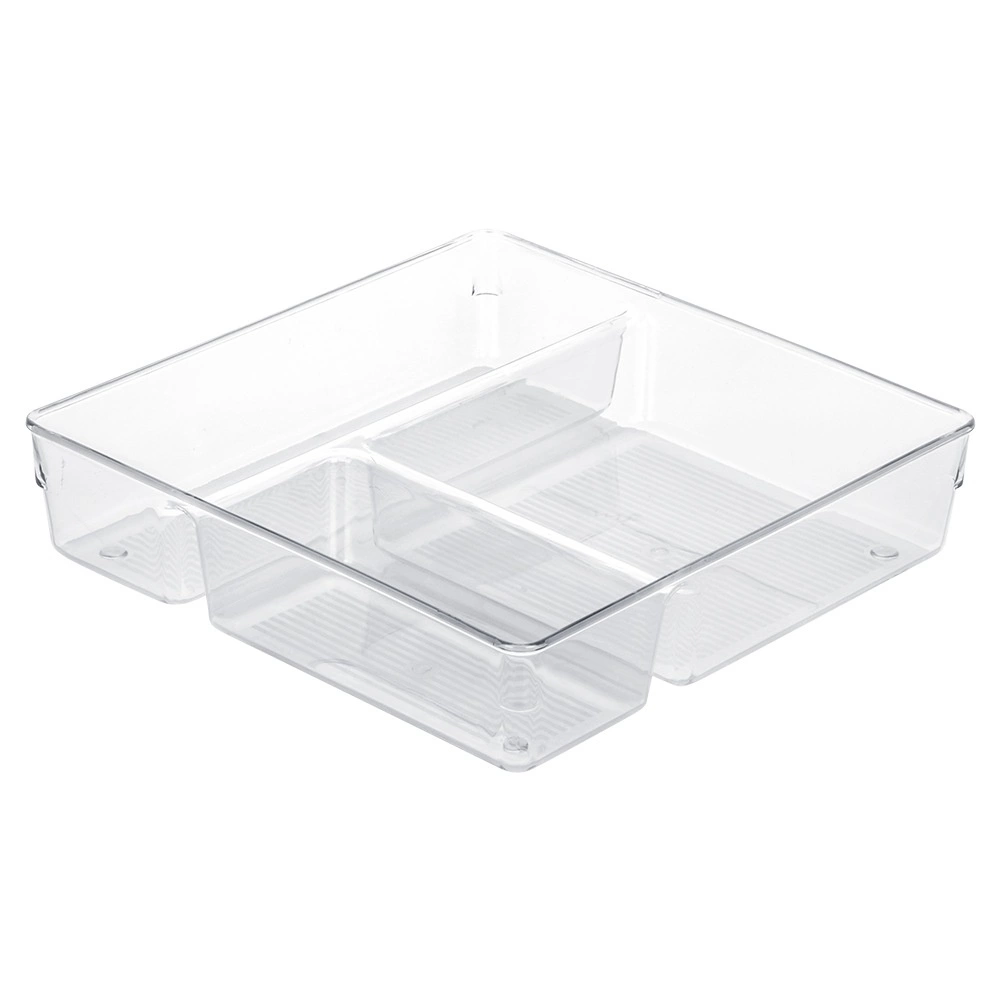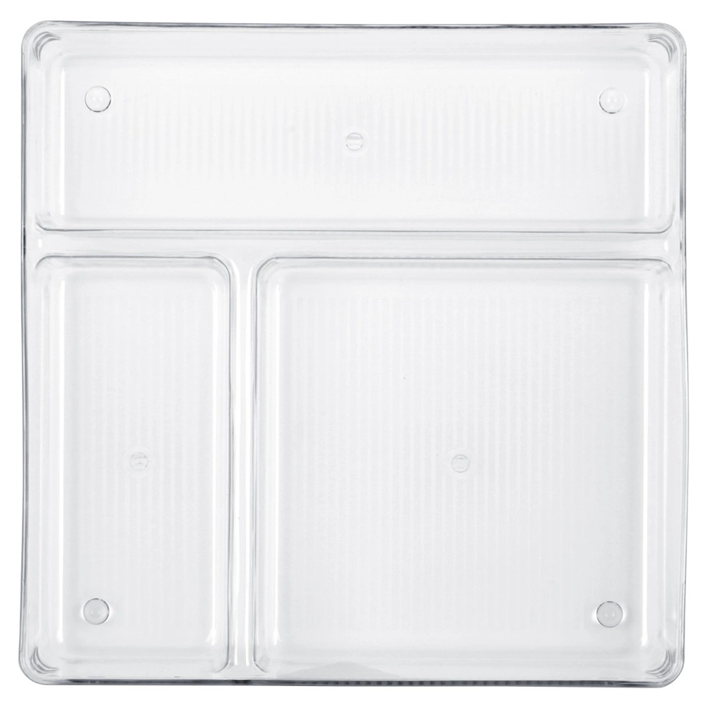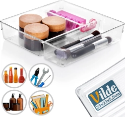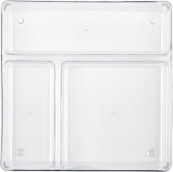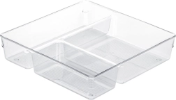 Pratique organiseur transparent pour tiroir, dimensions 23 × 23 × 5,5 cm, qui aide à maintenir l’ordre dans la cuisine, la salle de bain, le bureau et le dressing. Il possède trois compartiments de tailles différentes pour trier facilement les petits objets, est solide et résistant et, grâce à son design transparent, vous avez tout sous les yeux. Facile à nettoyer et résistant aux températures de -40 °C à +50 °C.