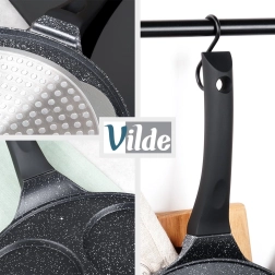 Grâce au corps en aluminium, la chaleur se diffuse rapidement et uniformément, ce qui fait gagner du temps et de l’énergie. La poignée confortable soft touch ne chauffe pas et dispose d’un trou pour l’accrochage, afin de ranger facilement la poêle et gagner de la place en cuisine.