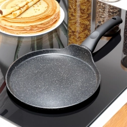 Poêle à crêpes légère et résistante en granit, diamètre 24 cm, pour des crêpes, pancakes et omelettes parfaitement fines. Grâce à son revêtement antiadhésif, sa répartition homogène de la chaleur et sa poignée soft-touch agréable, cuisinez sainement avec un minimum d’huile. Compatible avec tous les types de plaques, y compris l’induction, et facile à nettoyer, même au lave-vaisselle.