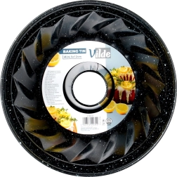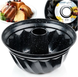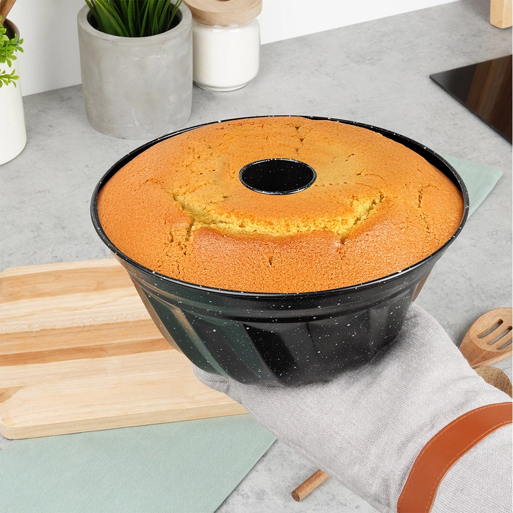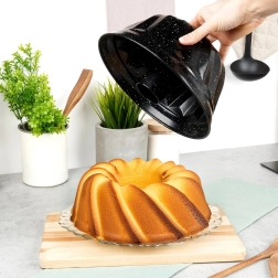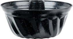 Moule à kouglof avec cheminée, diamètre 24,5 cm et hauteur 12 cm, en acier au carbone résistant avec revêtement antiadhésif effet granit. Assure une cuisson homogène, un démoulage facile et une forme décorative du gâteau. Compatible avec fours à gaz et électriques jusqu’à 230 °C.