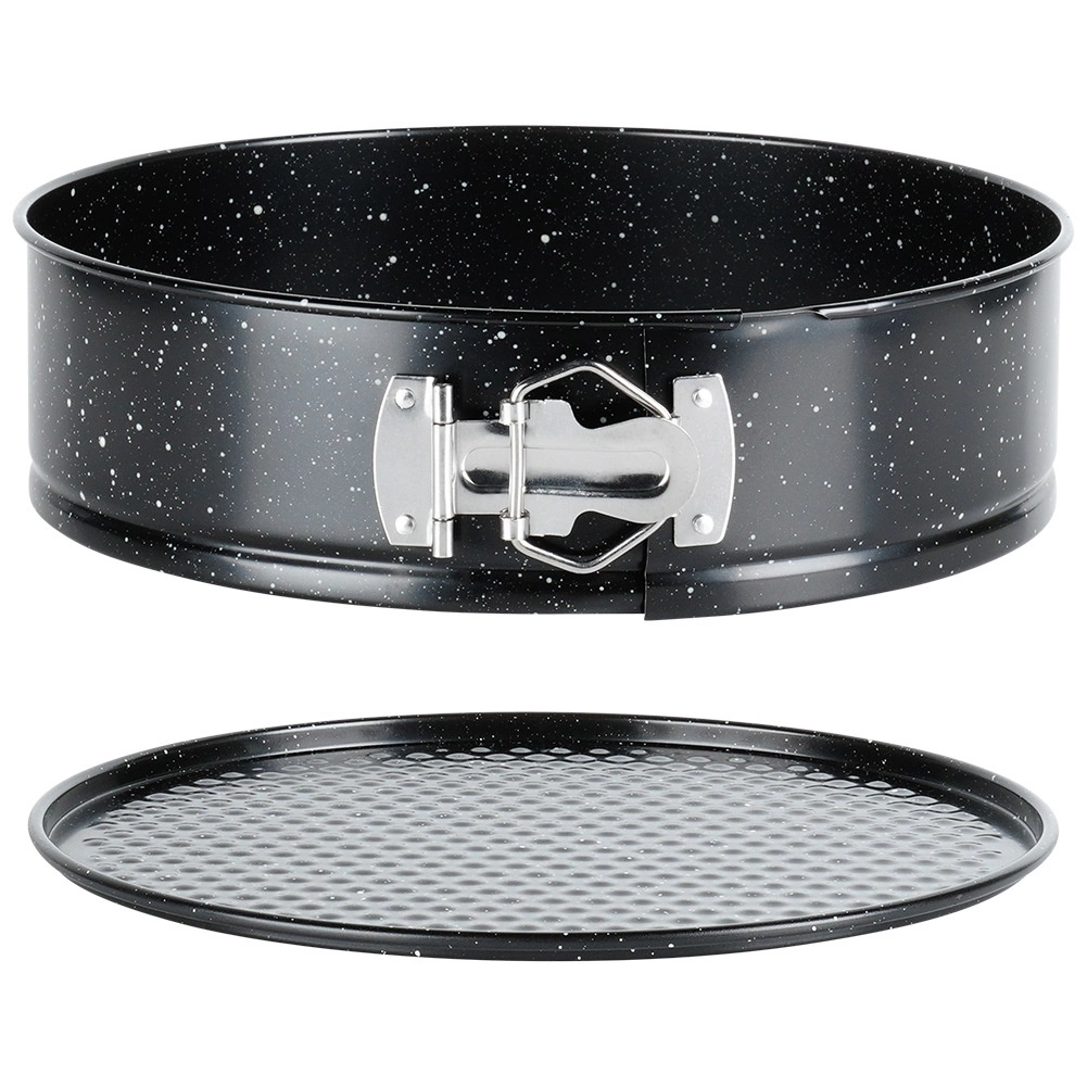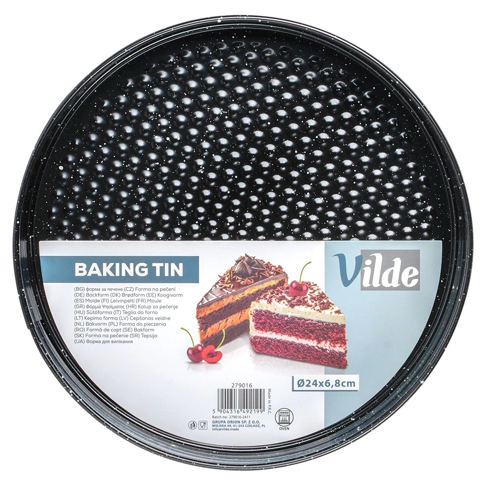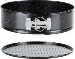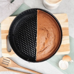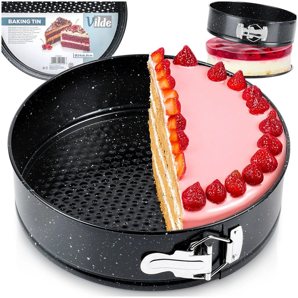 Moule rond pratique de 24 cm de diamètre en acier carbone résistant avec revêtement granité antiadhésif. Grâce aux bords à charnière et au fond amovible, vous démoulez facilement gâteaux et cheesecakes sans les abîmer. Le matériau assure une cuisson uniforme jusqu’à 230 °C et un nettoyage facile. Idéal pour la cuisson quotidienne de gâteaux, génoises, cheesecakes et desserts gratinés.