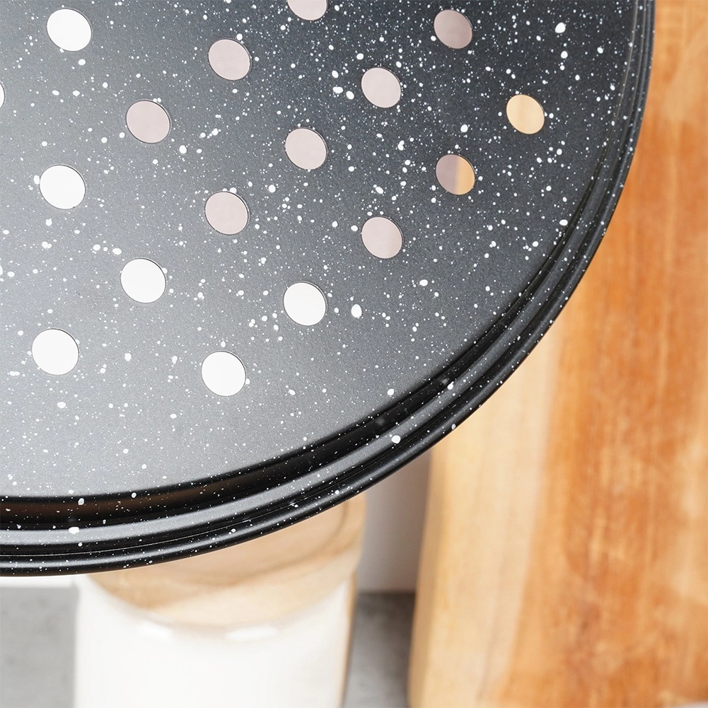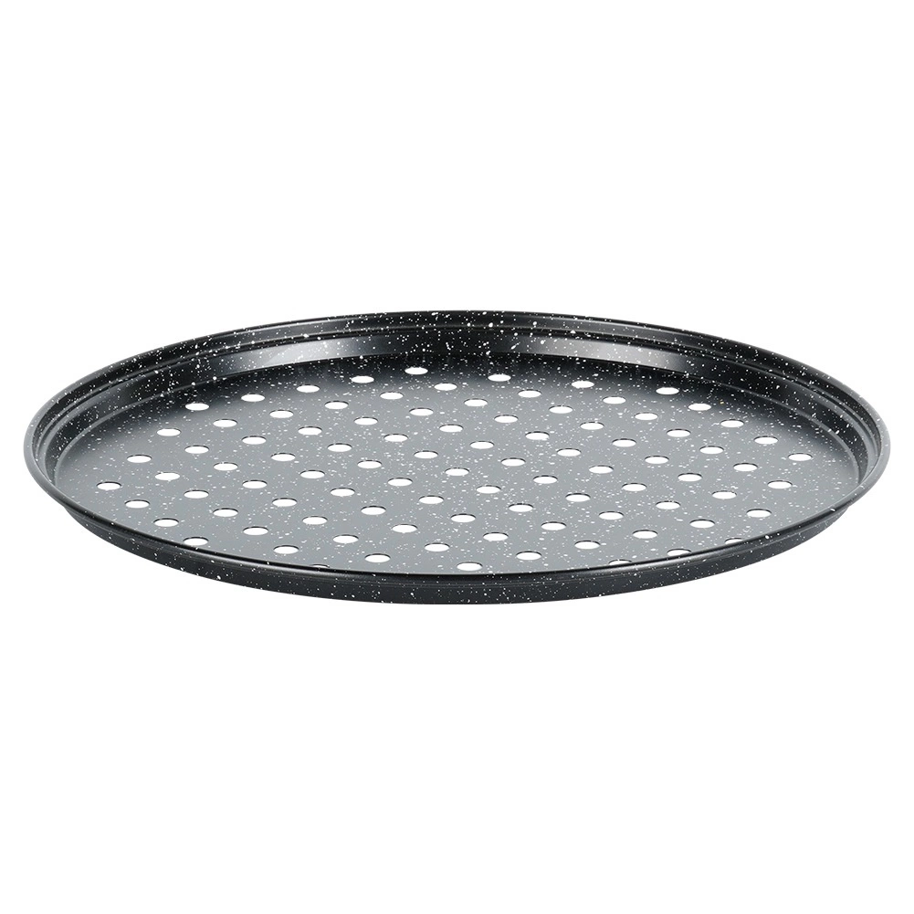 Moule à pizza rond de 28 cm de diamètre avec fond perforé pour une pâte croustillante, fabriqué en acier au carbone avec revêtement antiadhésif effet granit. Résiste à des températures jusqu’à 230 °C, doté d’un rebord plus haut pour une manipulation aisée et une belle forme de pizza. Convient aux fours à gaz et électriques.