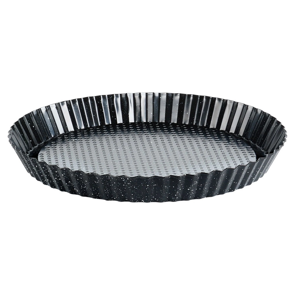 Moule à tarte rond pratique de 28 cm de diamètre et 3 cm de hauteur, en acier carbone robuste avec revêtement antiadhésif effet granit pour une cuisson uniforme et un démoulage facile. Les bords profilés créent une jolie dentelle de pâte et son usage polyvalent convient aux tartes sucrées et salées, quiches, tourtes ou plats gratinés. Entretien facile et résistance jusqu’à 230 °C.