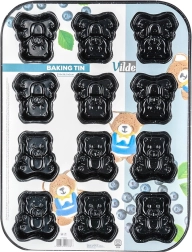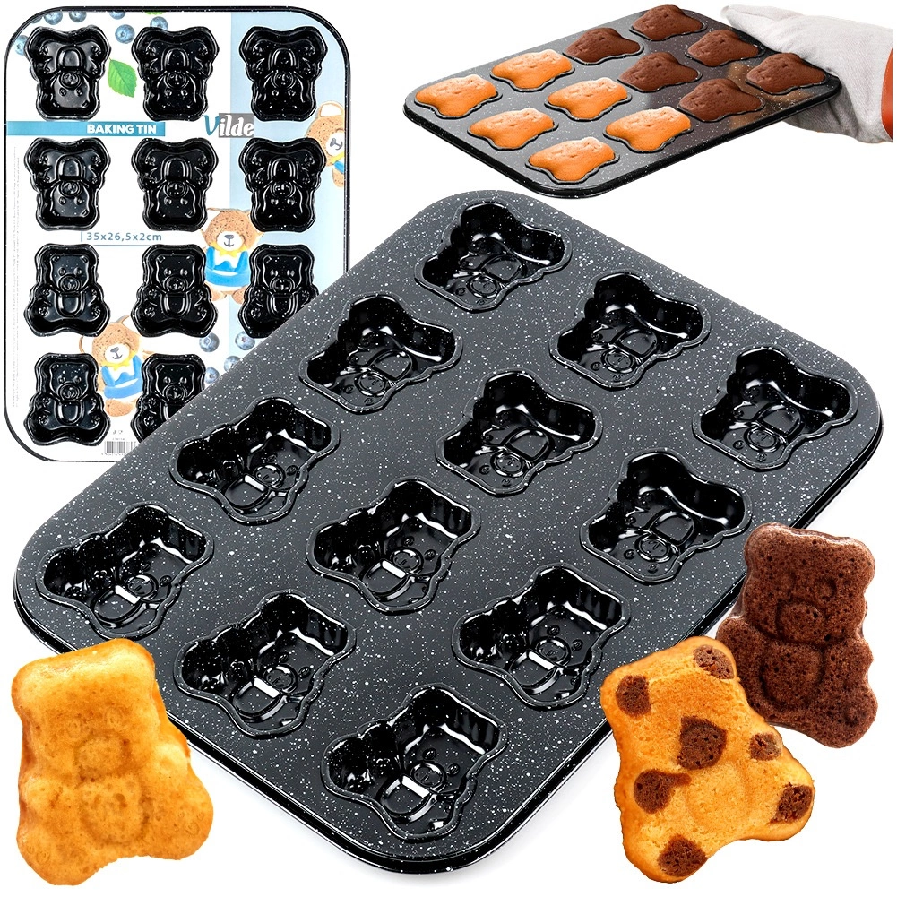 Moule de cuisson en granit avec revêtement antiadhésif pour 12 adorables oursons, assurant une cuisson homogène sans brûler. Résiste jusqu’à 230 °C, facile à nettoyer et compatible avec fours à gaz et électriques. Produit original de la marque VILDE.