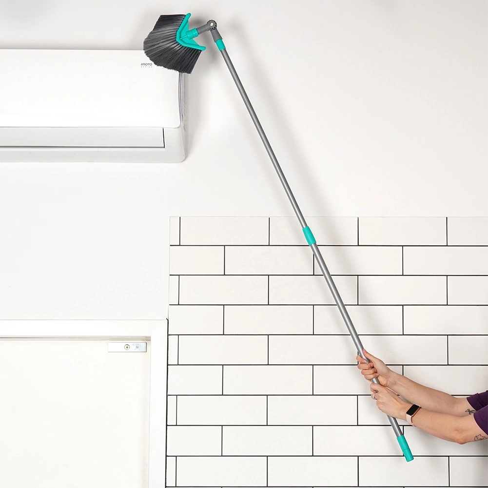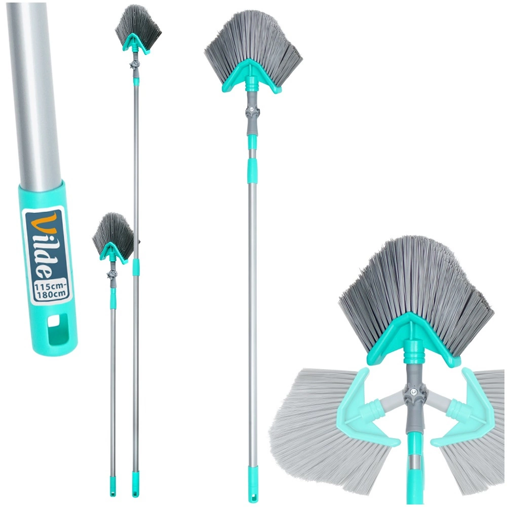 Balai télescopique pratique avec tête triangulaire orientable et longueur 115–180 cm pour nettoyer facilement les coins, plafonds et zones en hauteur. Tige métallique robuste et poils denses et rigides qui capturent efficacement la poussière et les saletés. Idéal pour la maison, le bureau et l’entrepôt.