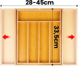 Organisez votre cuisine rapidement et efficacement. L’insert de tiroir en bambou, extensible de 35,5 à 54,5 cm, s’adapte à la plupart des tiroirs standards et offre suffisamment d’espace pour couverts, couteaux et ustensiles de cuisine. Dimensions en position fermée : 45,5 × 35,5 × 5 cm ; en position étendue : 54,5 × 45,5 × 5 cm.