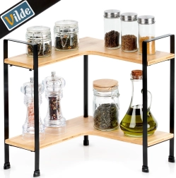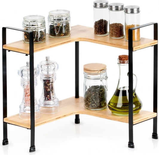 Gardez votre cuisine ordonnée et stylée avec cette étagère d’angle en bois de bambou sur une structure métallique robuste. Elle offre 2 niveaux de rangement, une forme en L pour les angles et des pieds métalliques stables avec protection de surface. Idéale pour les épices, tasses, bocaux et bols, elle économise de la place sur le plan de travail et s’intègre aux intérieurs modernes.